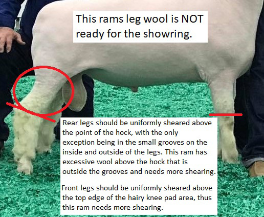 Highly objectionable dark color on the haired portion of two or more anatomical regions of the sheep (on two or more legs OR on one or more legs and head) will result in a disqualification. See Disqualification #3.